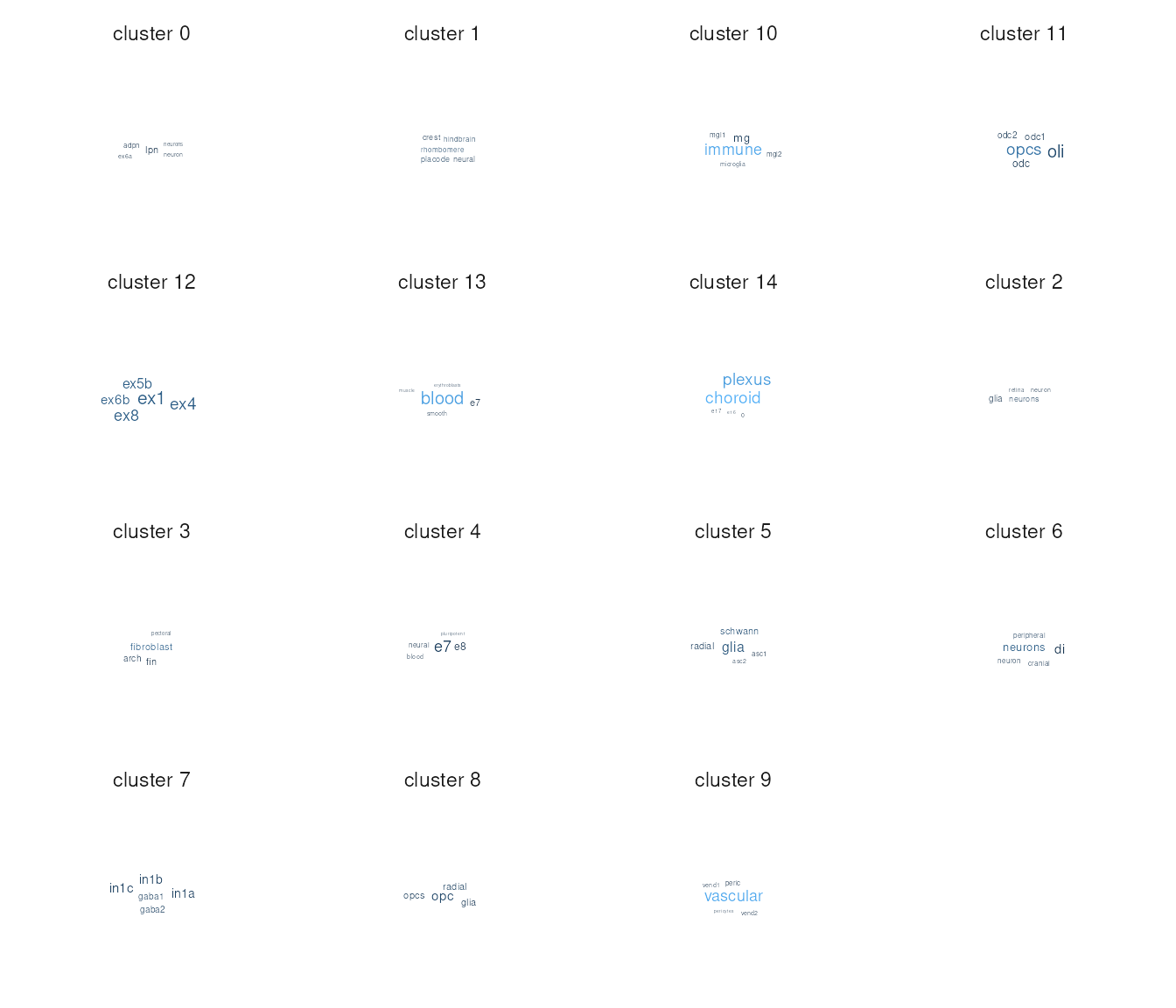 Clusters sharing similar enriched terms (e.g., “neuron”, “astrocyte”, “oligodendrocyte”) likely contain the same cell types from different datasets.
